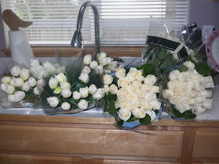 Also that day, Brianna had brought over dozens of tulips and roses so my sister-in-law Rachael could help make centerpieces. Brianna wanted to do a trial run to see how they would look and get a good idea on how many flowers were going to be needed for the day of the wedding.